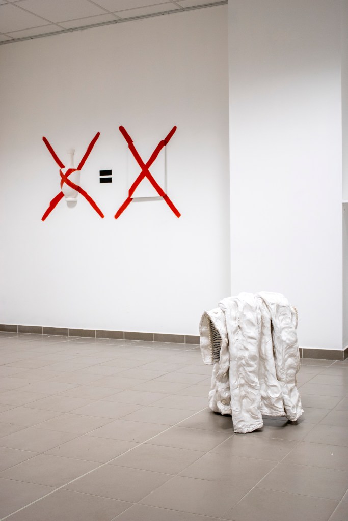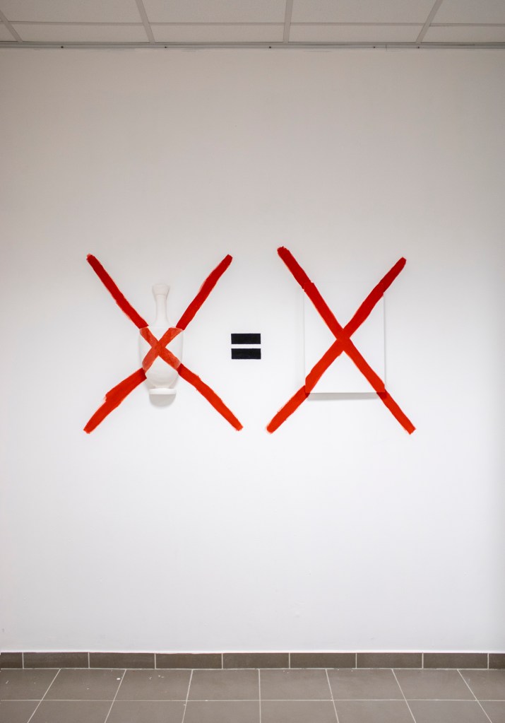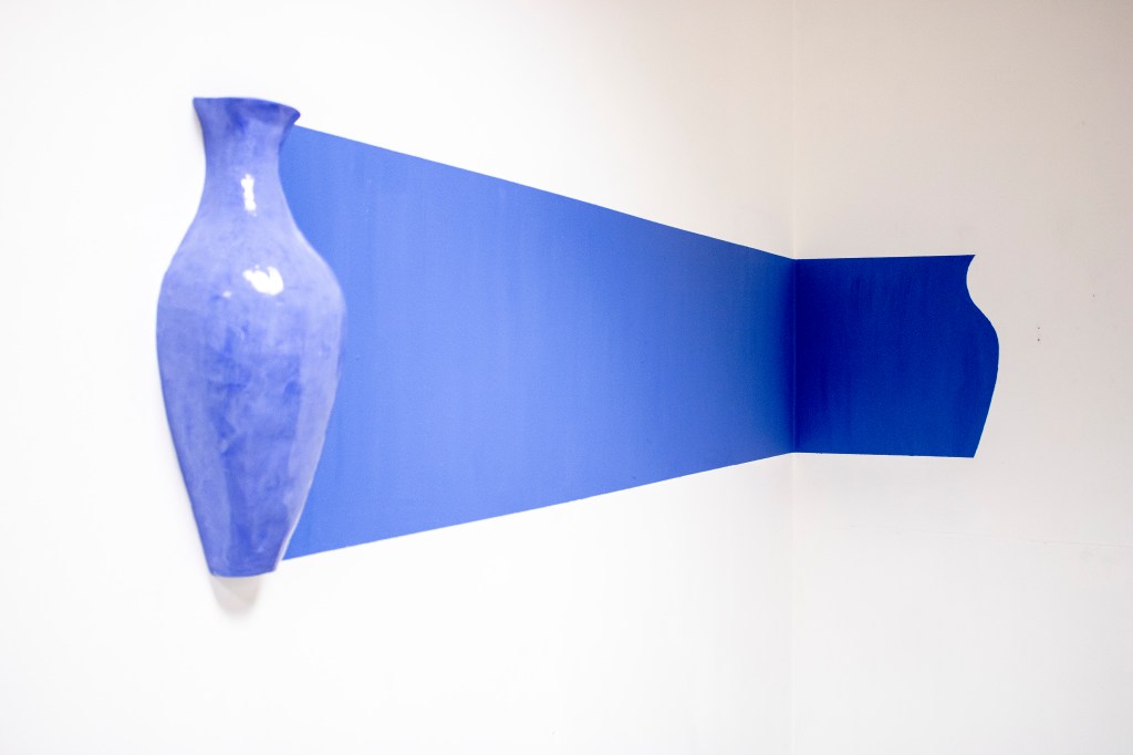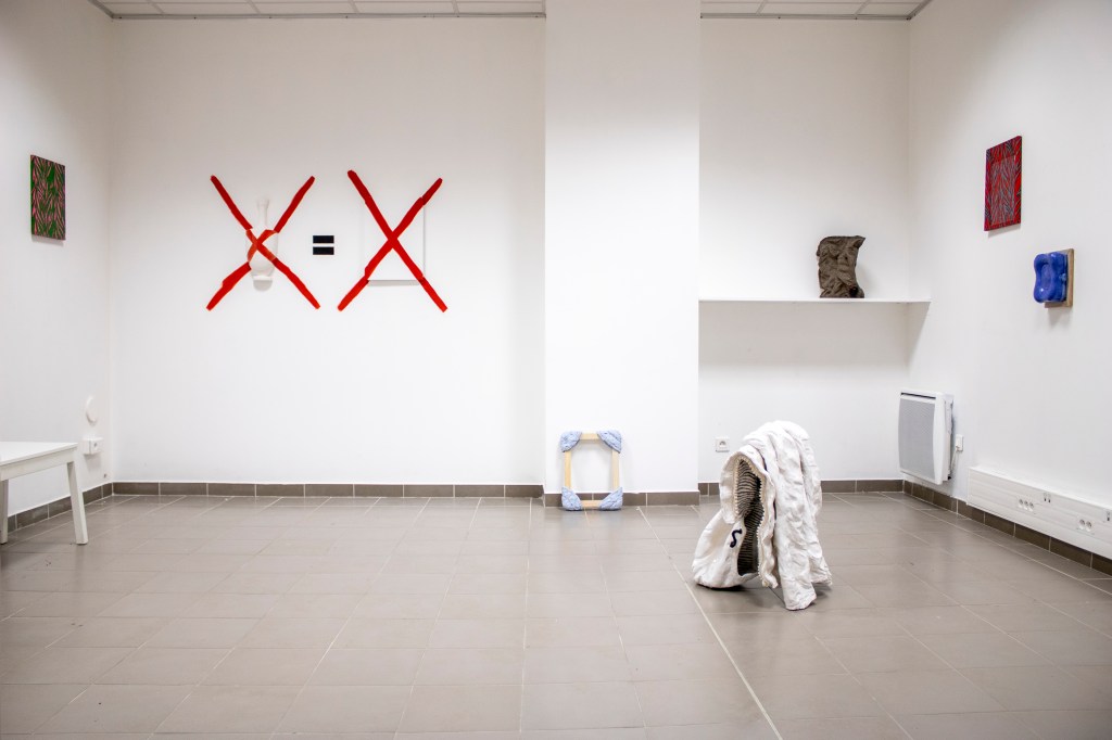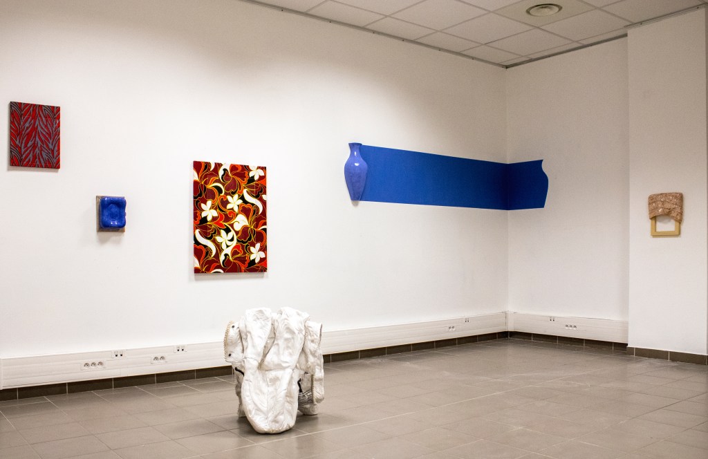 Le tissu fait office de trait d’union entre ces deux pratiques. En effet la peinture de Ninon a plus à voir avec la toile qu’avec la matière colorée qui la compose. Reléguée au rang de simple prétexte à peindre. Les toiles, devenues objets peints, cohabitent avec les sculptures en céramique émaillée.