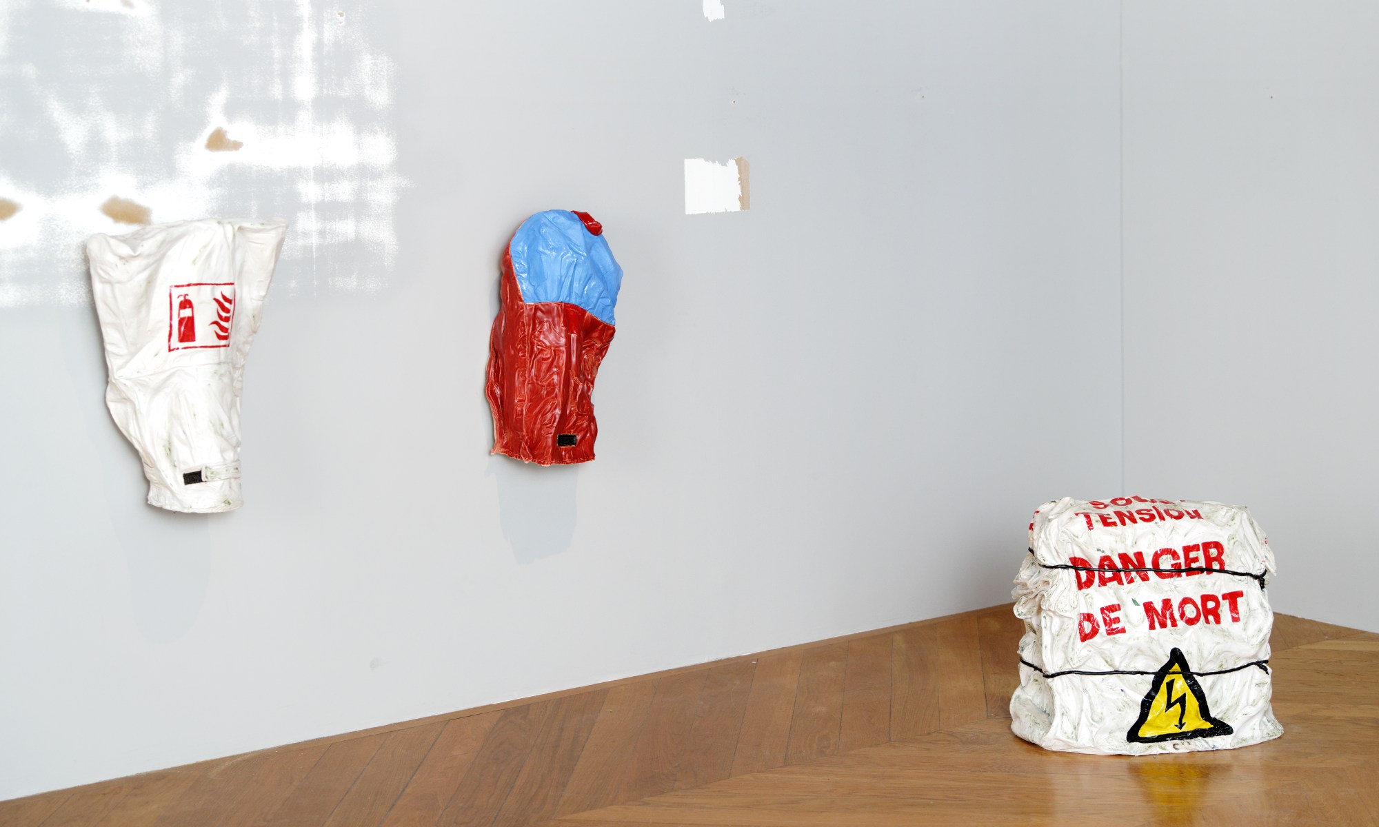 Pour Sur le feu, Ninon Hivert réalise trois nouveaux modelages : deux extincteurs sous house et un paquetage emballé, rebut électrique, signalé comme dangereux. Dans un écho au titre de l’exposition, ces sculptures témoignent de l’invisibilisation dans l’architecture de ces fragments industriels ordinaires. »